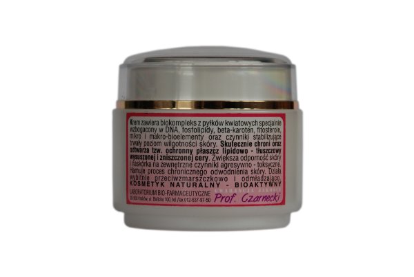 Biokrem do cery wybitnie suchej Opracowany przez profesora Ryszarda Czarneckiego ma rozwiązywać najczęściej występujące problemy skóry. Krem skutecznie usuwa problemy: odwodnienia, wysuszenia, zmatowienia, szorstkości, złuszczenia, pękania naskórka oraz usuwa zmarszczki z widocznym odtłuszczeniem i zmniejszonym nawilżeniem. Laboratorium Bio-Farmaceutyczne korzystając z najnowszych odkryć medycyny, biologii molekularnej i kosmetologii proponuje Paniom kosmetyk dla cery szczególnej troski, Oparty on jest na działaniu bio-kompleksu uzyskanego z pyłków kwiatowych i jego bezkonkurencyjnego i wszechstronnego działania na skórę. Skład wg INCI: aqua, mineral oil, C 10-30 cholesterol/ lanosterol esters, sorbitan sesquioleate, glycerin, microcrystalline wax, oleum amygdalarum, beeswax, vitamin E acetate, pollen (bee pollen) extr. lyophilizat., pollen extr. fat soluble, pollen extr. spissum, pollen extr. dialys., parfum, diazolidinyl urea (and) methylparaben (and) propylparaben (and) propylene glycol |