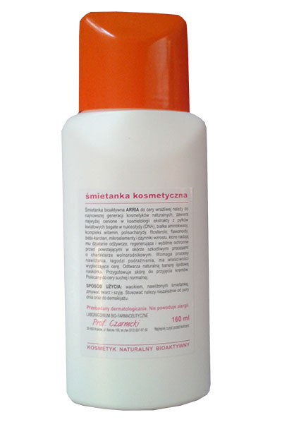 Śmietanka bioaktywna Śmietanka bioaktywna ARRIA do cery wrażliwej należy do najnowszej generacji kosmetyków naturalnych, zawiera najwyżej cenione w kosmetologii ekstrakty z pyłków kwiatowych bogate w nukleotydy (DNA), białka aminokwasy, kompleks witamin, polisacharydy, fitosterole, flawonoidy, beta-karoten, mikroelementy i czynniki wzrostu, które nadają mu działanie odżywcze, regenerujące i wybitnie ochronne przed powstającymi w skórze szkodliwymi procesami o charakterze wolno rodnikowym. Wzmaga procesy nawilżania łagodzi podrażnienia, ma właściwości wygładzające cerę. Odtwarza naturalna barierę lipidowe naskórka. Przygotowuje skórę do przyjęcia kremów. Polecany do cery suchej i normalnej.