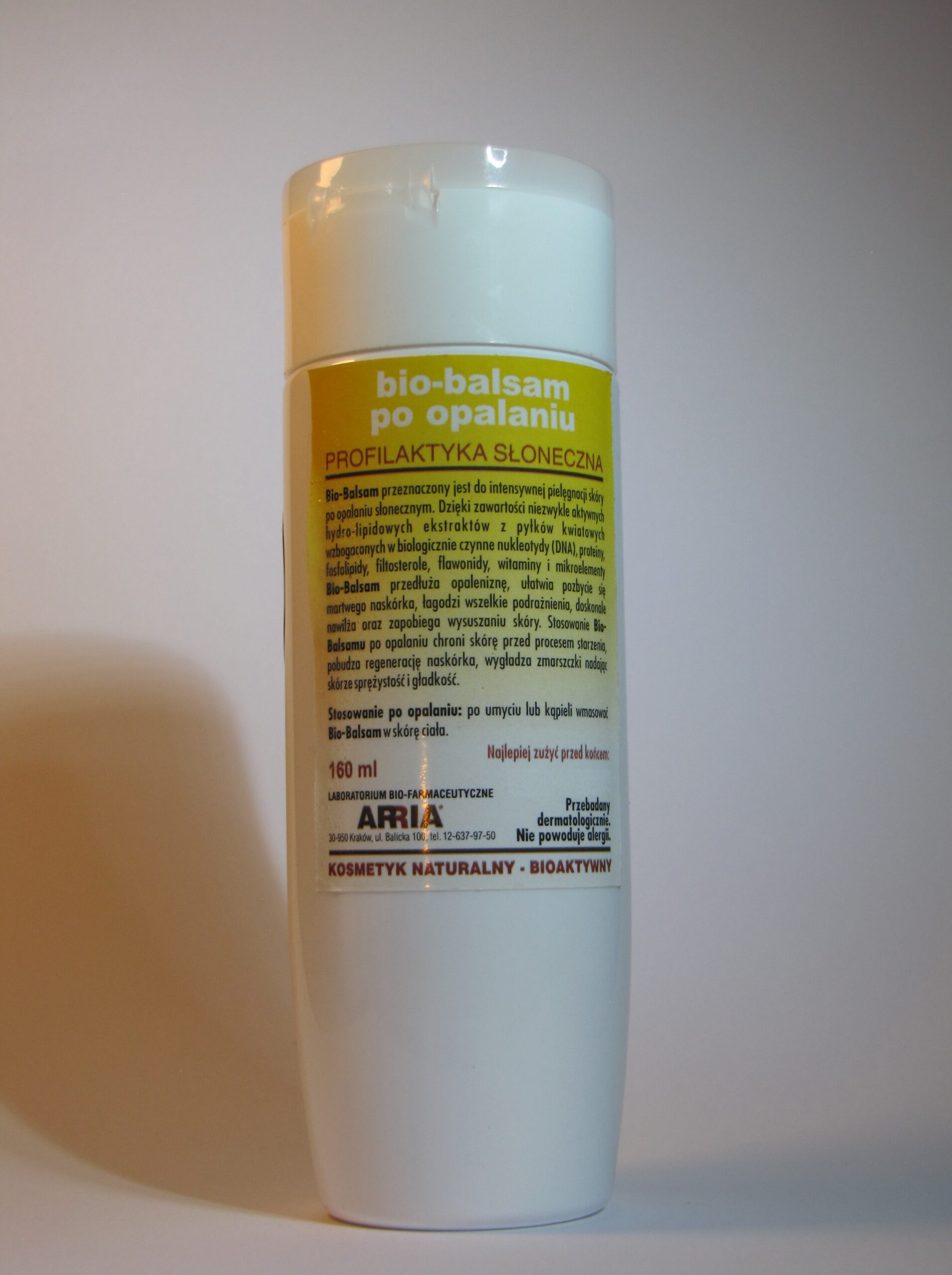 Bio-Balsam Arria intensywnie pielęgnuje skórę po opalaniu słonecznym. Dzięki zawartości niezwykle aktywnych hydro-lipidowych ekstraktów z pyłków kwiatowych wzbogaconych w biologicznie czynne nukleotydy (DNA), proteiny, fosfolipidy, filtosterole, flawonidy, witaminy i mikroelementy. Bio-Balsam przedłuża opaleniznę, ułatwia pozbycie się martwego naskórka, łagodzi wszelkie podrażnienia, doskonale nawilża oraz zapobiega wysuszaniu skóry. Stosowanie produktu po opalaniu chroni skórę przed procesem starzenia, pobudza regeneracją naskórka, wygładza zmarszczki nadając sprężystość i gładkość.