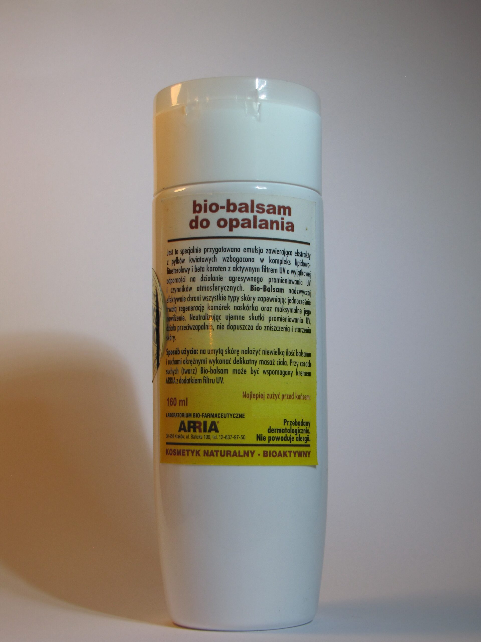 Bio-balsam Arria do opalania jest emulsją, z ekstraktem z pyłków kwiatowych .Posiada on unikalny kompleks lipidowo – fitosterolowy i beta karoten oraz dodatkowo naturalny filtr słoneczny UV o skutecznym  działaniu .