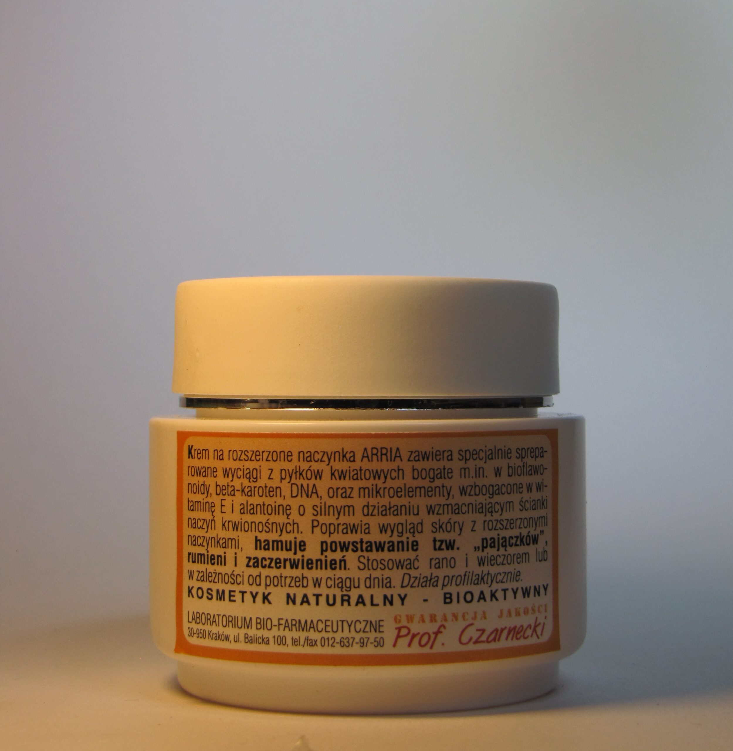 specjalnie wyselekcjonowane wyciągi z pyłków kwiatowych bogatych m. in. w DNA i flawonoidy z dodatkiem alantoiny, olejku ze słodkich migdałów oraz witaminy E. Krem Arria pielęgnuje i normalizuje wygląd skóry z rozszerzonymi naczynkami . Dostarcza on skórze wiele witamin, soli mineralnych i mikroelementów odżywczych dla utrzymania fizjologii skóry, Po zastosowaniu cera jest znakomicie  natłuszczona , nawilżona i wygładzona . krem Arria naczynkowy ma działanie  profilaktyczne  i lecznicze .